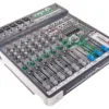 It offers robust connectivity with six XLR mic inputs, four mono 1/4″ line inputs, and two stereo 1/4″ line inputs. A Hi-Z switch on channel 4 enables the direct connection of instrument-level signals such as a guitar or bass without requiring an external DI. Each channel has a switchable high-pass filter, 3-band EQ, mute button, clip indicator, and 60 mm fader.